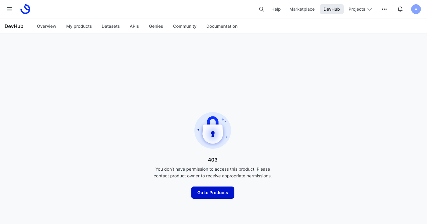 When your role is removed from a product, the product is removed from your My Products page in DevHub. If you select your previous email invitation to access the product, you see a 403 error indicating that you no longer have permission to access it.