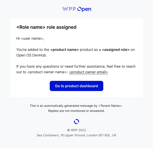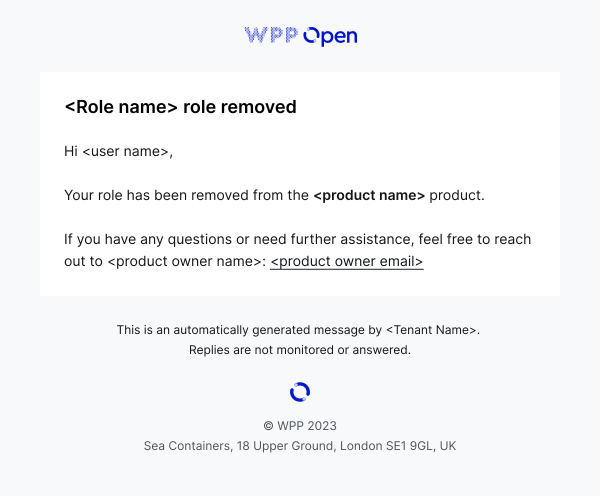 If a user's role is removed, they receive an email notification informing them that their role for the product has been revoked.